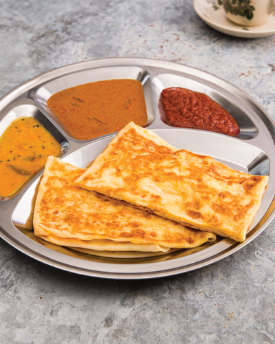 A variant of the ever popular Roti Canai, with egg throughout the bread. Comes with curry sauce, sambal and dhal.Roti, Vegetarian
