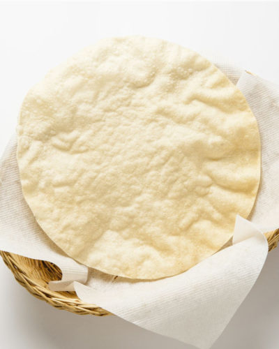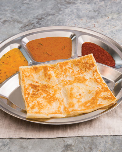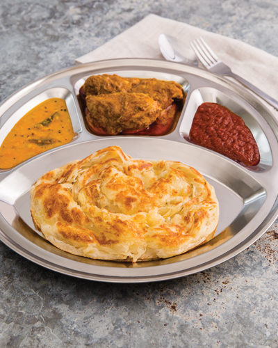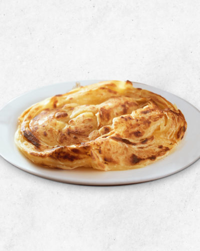 A hand tossed bread that is soft and fluffy on the inside but crisped to perfection to give it a crunchy flaky layer on the outside. Served with curry sauce, sambal and dhal.