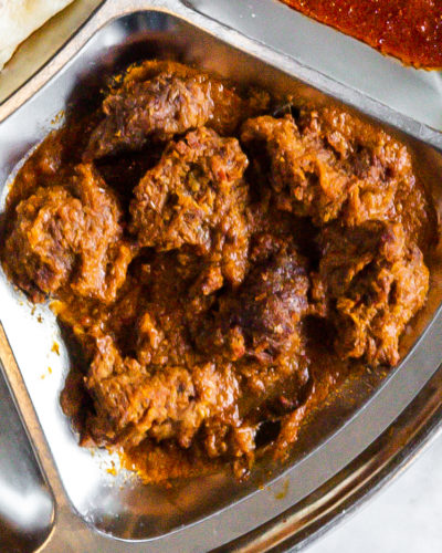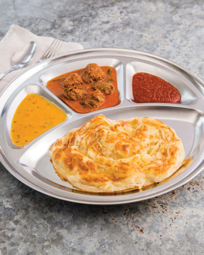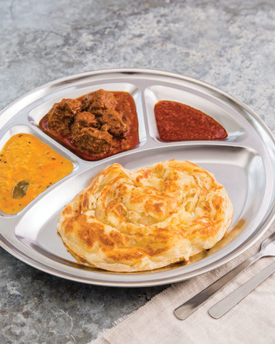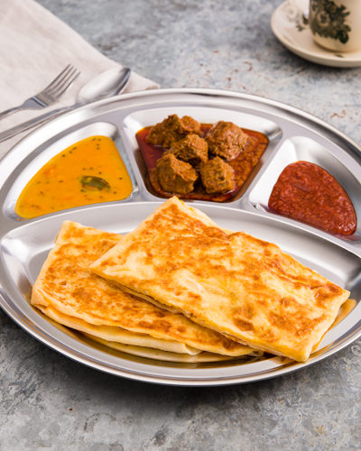 A hand tossed bread that is soft and fluffy on the inside but crisped to perfection to give it a crunchy flaky layer on the outside. Served with beef rendang, sambal and dhal.