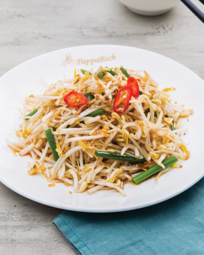 Stir fried fresh bean sprout with salted fish, chives in light soy sauce.