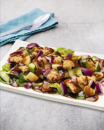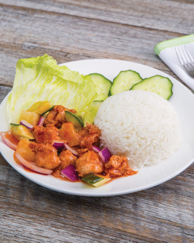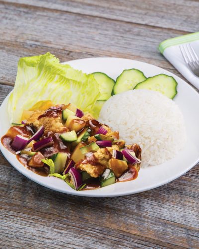 Jasmine rice served with vegetarian sweet and sour chicken, pineapple, onion, cucumber, and lettuce.