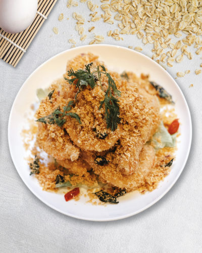 Aussie Banana Prawns covered in crispy buttery cereal, fried with curry leaves and chilli, giving the dish a sweet and savoury taste. The cereal crumbs go especially well with rice.
