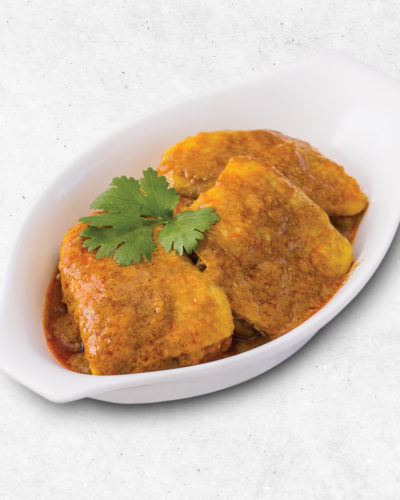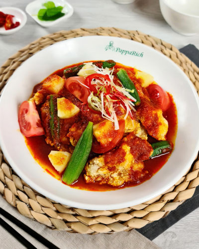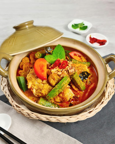 Fish head served with okra, tofu puff, and tomatoes in a claypot filled with flavourful curry, best eaten with jasmine rice. Rice to be ordered separately.