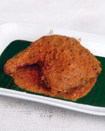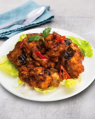 Boneless chicken covered in crispy buttery cereal, fried with curry leaves and chilli, giving the dish a sweet and savoury taste. The cereal crumbs go especially well with rice.