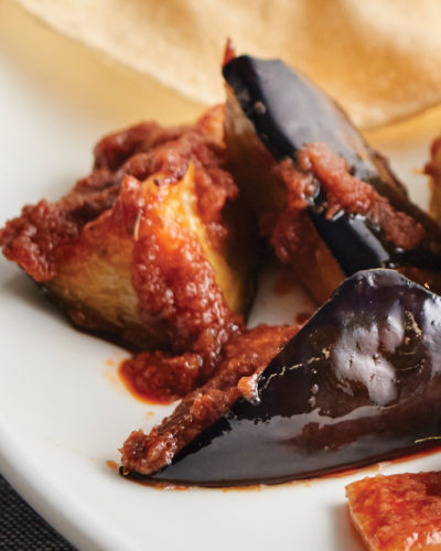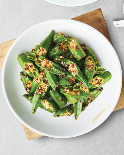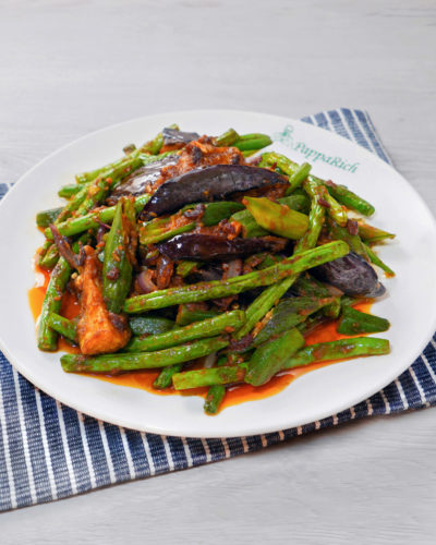 Okra, eggplant, and long beans stir fry together with our secret shrimp paste. *This is not a vegetarian dish.