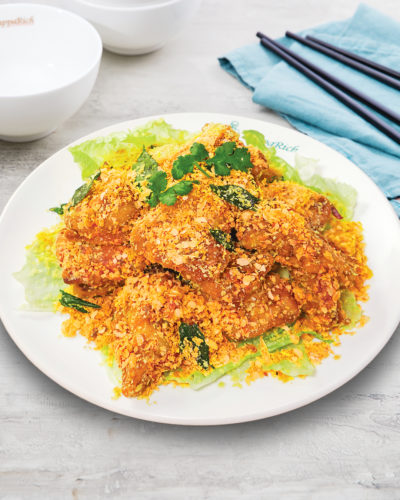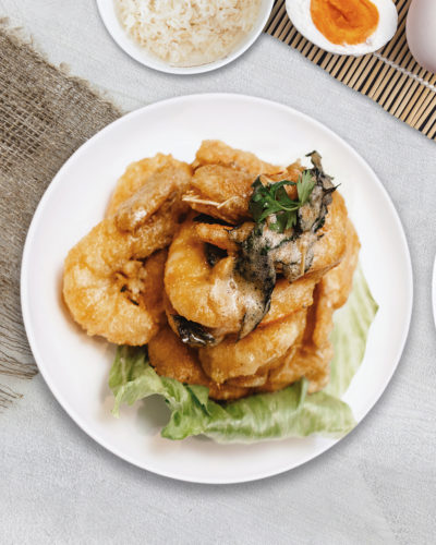 Deep fried Aussie Banana Prawns drenched in creamy butter, salted egg yolk, and curry leaves. Wok stir fried to bring the flavours together.