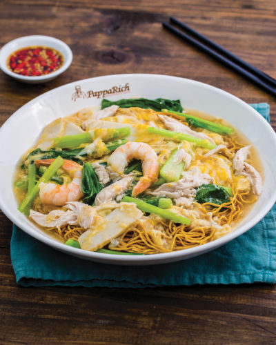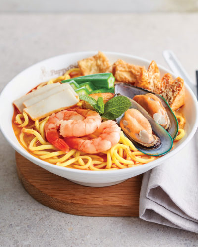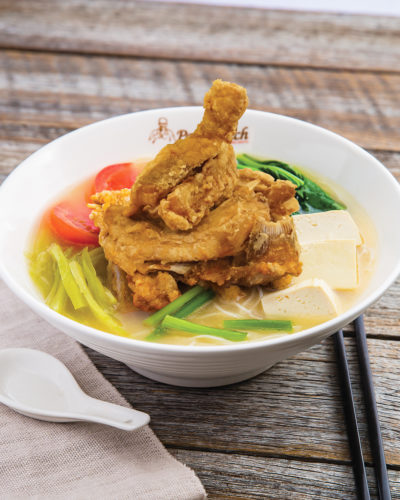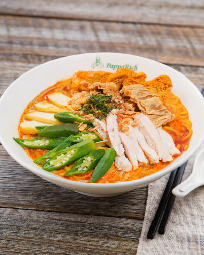 Dry egg noodles doused in rich curry gravy and topped with choy sum, red chilli, fried shallots and a serve of steamed chicken.Noodles
