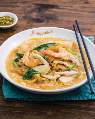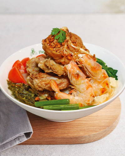 Thin flat rice noodles in fresh prawn head broth. Topped with prawns, chicken slices, chives, red chilli, and bean sprouts.
