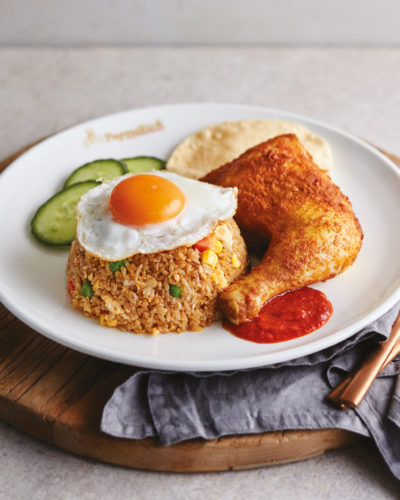 Mixed vegetable wok-fried rice served with Malaysian style fried chicken, fried egg, pappadum, sambal, and cucumber slices.