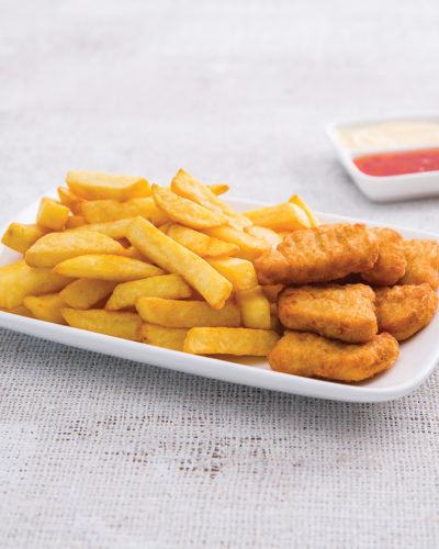 6 pieces of chicken nuggets and chips served with mayonnaise and sweet chilli sauce.