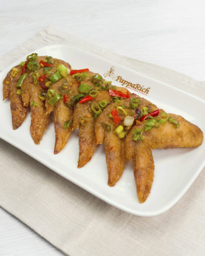 6 pieces of flavoured pack salt & pepper chicken wings deep fried to a golden hue.