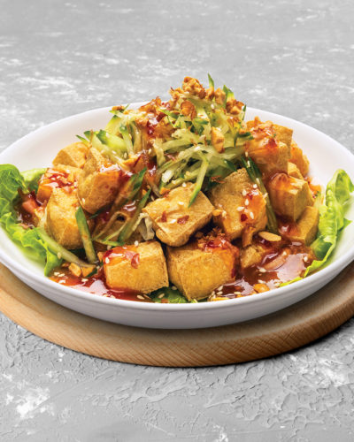 Deep fried tofu on a bed of lettuce. Topped with julienne cucumbers, crushed peanuts, and sesame seeds, dressed with sweet chilli sauce.