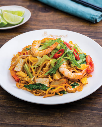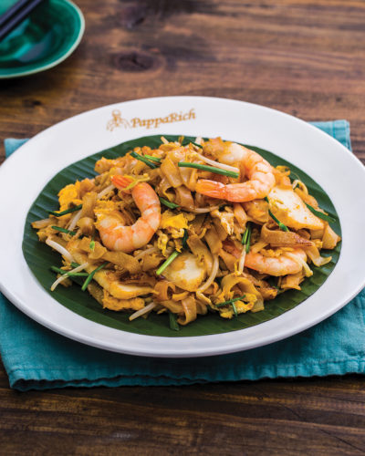 Wok-fried rice starch noodles with chicken slices, prawns, egg, bean sprouts, chives, and red chilli.