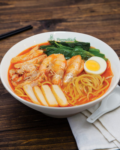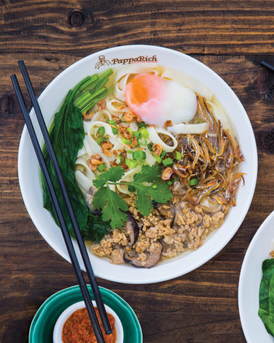 Flour noodles in freshly boiled anchovy based soup. Served with minced chicken, fried anchovies, mushrooms, spinach and topped with a half-boiled egg. (PLEASE NOTE, for takeaway hard-boiled egg is served)Noodles