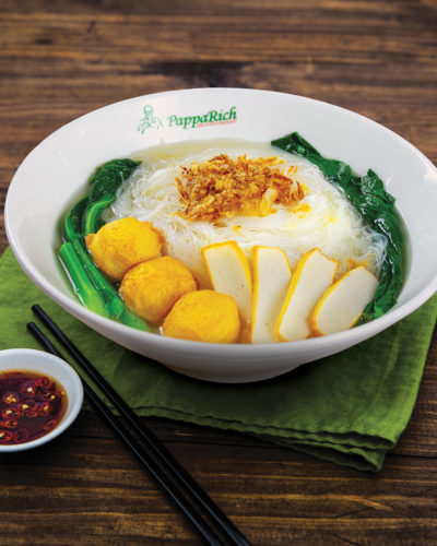 Thin vermicelli served in chicken broth with fish ball, fish cakes, choy sum, and shallots.