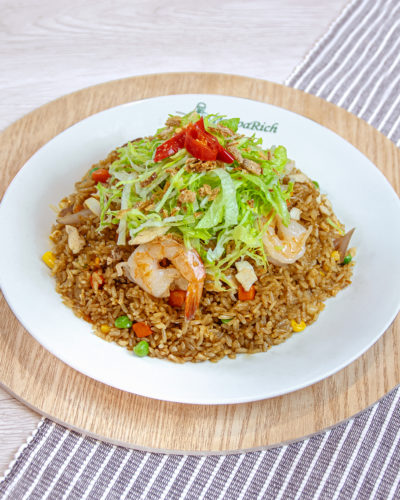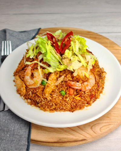 Mixed vegetable wok-fried rice together with sambal, chicken slices, and prawns. Topped with lettuce, fried shallots, and chilli. This dish is spicy.