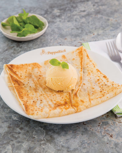 A sweet Roti dish with sliced banana cooked inside the dough. Served with 1 scoop with green tea or black sesame ice-cream on top.Roti