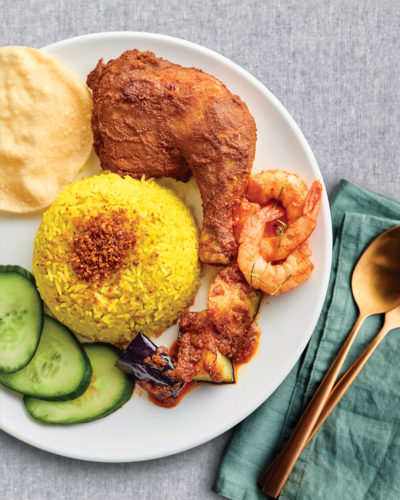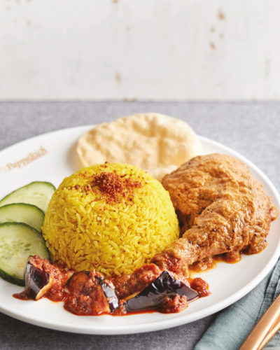 R28 – Nasi Kunyit with Masala Fried Chicken & Sambal Eggplant