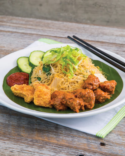 Fried thin vermicelli noodles served with Vegetarian Curry Mutton, beancurd skin, sliced cucumbers, tofu, lettuce, and egg.