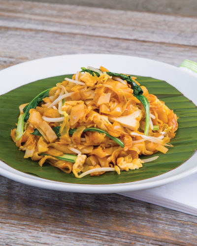 Our vegetarian version of Char Koay Teow comes with wok-fried flat noodles with sliced tofu, egg, bean sprouts, and choy sum.